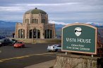 Vista House overlooking the Columbia river valley. After about 20 minutes it was time to move on. The bus driver drove around the circle behind the Vista House, a feat not to be duplicated. It was TIGHT and at times the bus was up on the steps. Because of a closed road, we had to backtrack to get to our next stop, Multnomah Falls. A short walk under the highway broght us within photo distance, except for the Pins whose camera could take a picture of Plymouth Rock from California. Jack and Denise made their way up to the bridge and got pictures of us looking down.