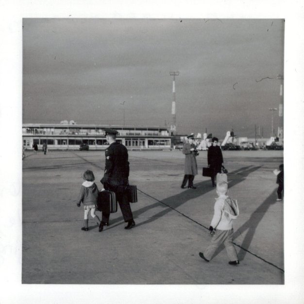 This photo was taken at McGuire AFB in New Jersey in December, 1967 on our return from Germany. We had moved back from Germany, and were on our way to Kentucky to visit relatives. In the picture, my father is walking with me at his side with my little brother several steps behind us (he has the white hair). My mother took the picture. |