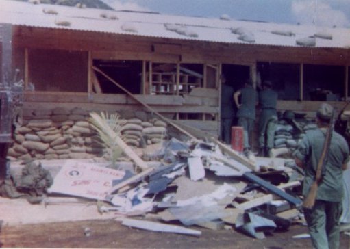 Is being awakened by automatic gunfire and explosions. I rolled out of my bunk reaching for Hansen, but he wasn’t there. I made it to the door and saw automatic gunfire coming from the corner of the orderly room. A brother made it to the doorway with me, jumped over me and headed down the stairway, I was close behind. As I rounded the orderly room, I popped off three rounds toward where the gunfire was coming from and checked it the next day, I hit nothing. There was a Jeep sitting in front of the orderly room so I dove under it. As I was looking out from under the Jeep, I saw what looked like a VC standing in the middle of all the gunfire and explosions. I started to take aim, but there was another explosion and the light from that explosion was bright enough so that I could tell that it was a GI standing there. I guess I worked up enough courage to run out and get him. I was one scared puppy, for sure. We made it to the bunker on the perimeter. I had to get to the front gate so I busted ass down there. I never knew who the GI was and always wondered if he made it or not. When I got to the gate, I was told that Hansen didn’t make it.